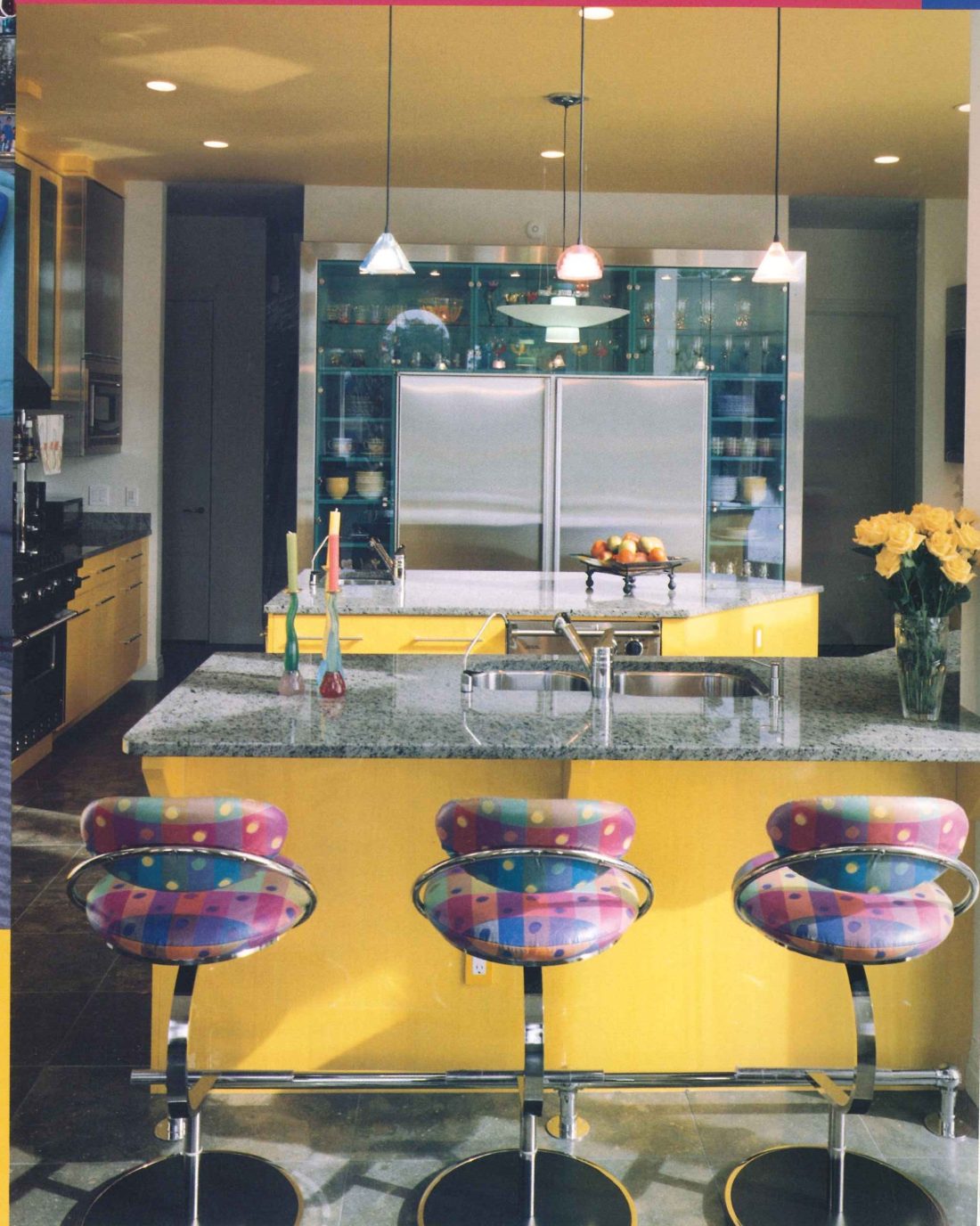 Bright yellow Italian Pace chairs add bursts of color in the contemporary living room. The room’s focal point is the brushed stainless steel mantel and Blue Pearl granite fireplace.