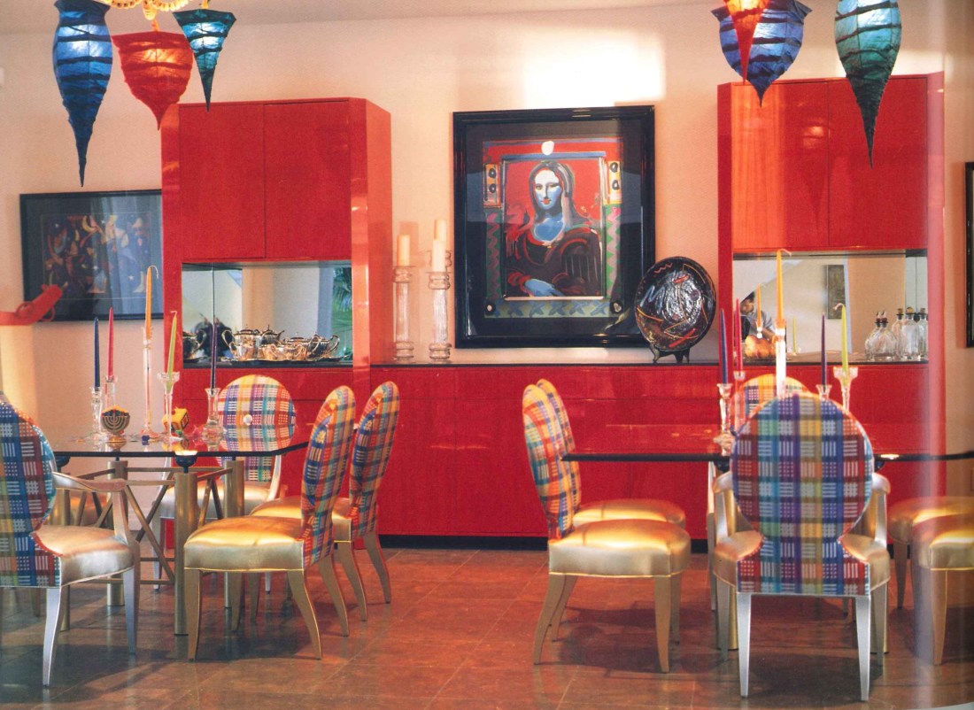Above: Unique papier-mache and rope chandeliers coordinate perfectly with the rich red custom credenza and colorful fabric chair backs. Alternating gold and silver chair seats harmonize with glass topped silver table bases and glass accessories.