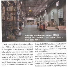 With a straightforward operating philosophy-“deliver value and apply that principle to every phase of the business”-Quoizel offers a full product line of more than 2,000 items, including wall fixtures, table and floor lamps, as well as one of the industry’s largest selections of Tiffany-styled pieces. The company’s designers stay on the cutting edge of trends in residential architecture and interior design. In 1998 Quoizel introduced it’s furniture line and last year debuted Lenox Lighting, a lighting collection in conjunction with Lenox China.